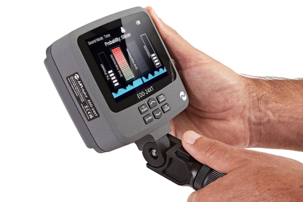 The device uses “Harmonic Analysis.” Genuine electronics produce a strong 2nd Harmonic signal. Non-threatening materials, such as rusty nails or bimetallic junctions (often called “false junctions”), typically produce a 3rd Harmonic signal. The EDD-24XT uses an intelligent algorithm to compare these and notify the user if the material is likely ‘Silicon’ or ‘Metal’.